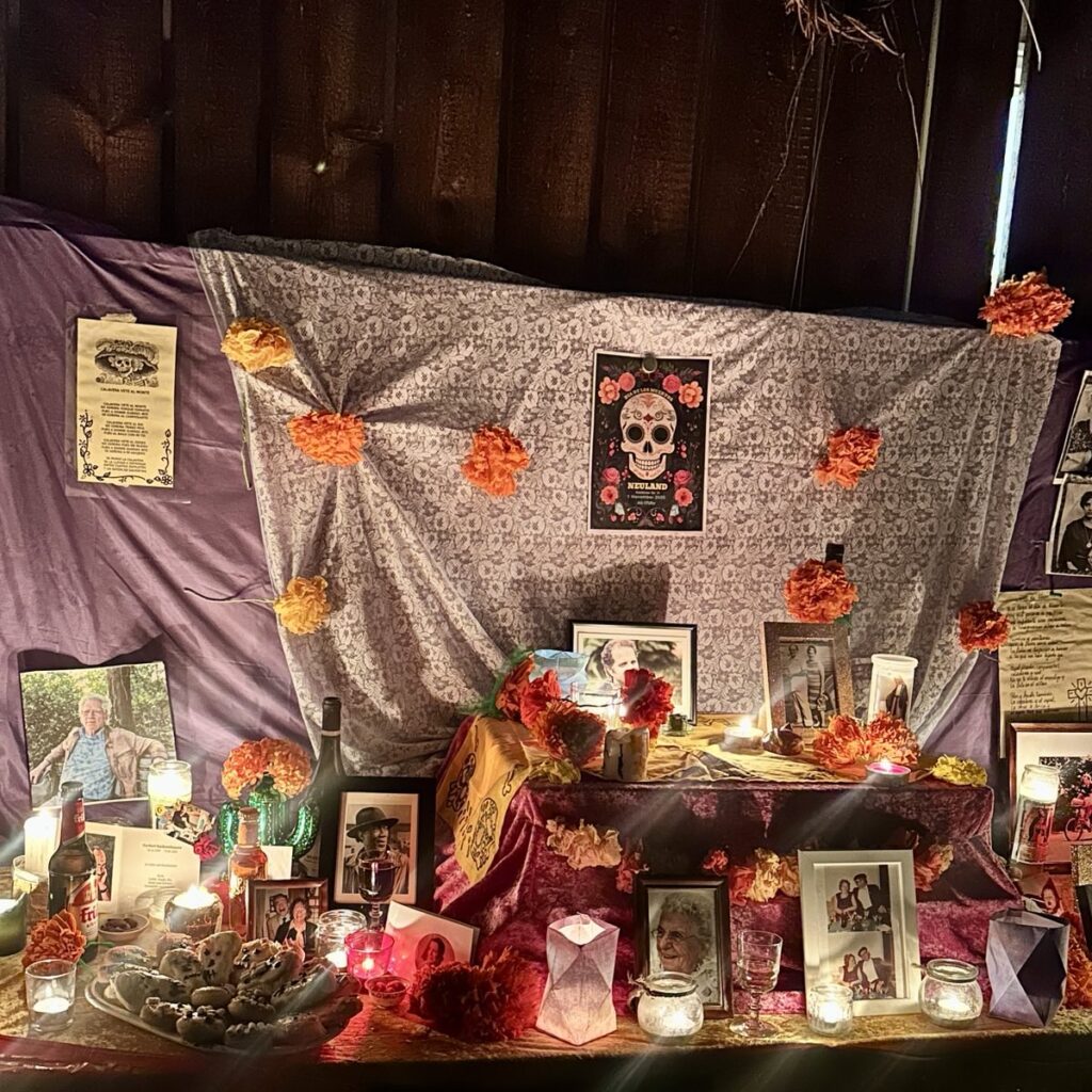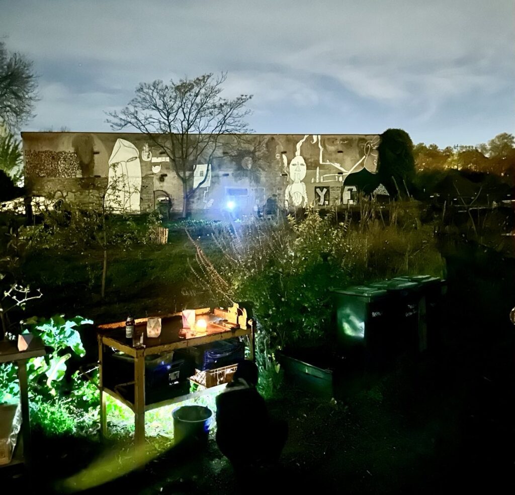 An einem 1.11. hatte sie mal eine Art festlichen Altar vor der Gartenküche aufgebaut, den ganzen Ort bunt mit Totenkopf-Deko und Kreppblumen geschmückt und mit Kerzen beleuchtet. Auf dem Altar zwischen üppigem Blumenschmuck stand ein schwarz-weiß Foto von ihrer Uroma und eine Leckerei, die diese gerne gegessen hatte. Sie erzählte uns davon, wie man in Mexiko rund um den 1.11. seine Toten ehrt und: feiert. Nach und nach stellten auch die anderen NeuLänder*innen und Gäste Bilder ihrer verstorbenen Familienmitglieder oder Freunde dazu, mal mit einem Glas Wein für den Ahnen, mal mit einem Gegenstand. Erinnerungen werden ausgetauscht es kommt zu schmerzhaften Momenten und auch ein paar bitterliche Tränen fließen.